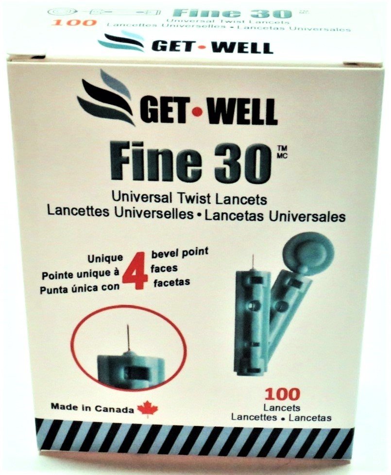 100 GETWELL Fine 30g Lancets. Unique Quad Bevel Point Offers Maximum Comfort. Less Painful than other bi/tri bevel lancets.