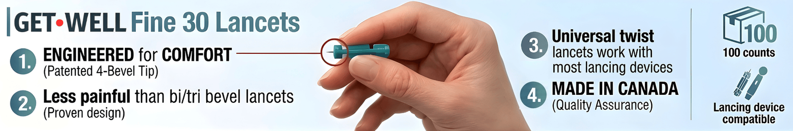 GET•WELL Lancets are designed with “Shallow Point” Comfort Optimization for maximum comfort; the quad-bevel, thin gauge needle with its shallow-angled edges act like blades giving a smoother, less painful penetration without tearing the skin. This results in quick healing and a less discomforting experience every time you need to do a blood test.