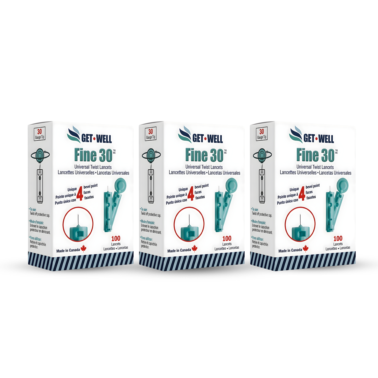 Pack of 3 Boxes - Total 300 GET•WELL Fine 30g Universal Twist Lancets